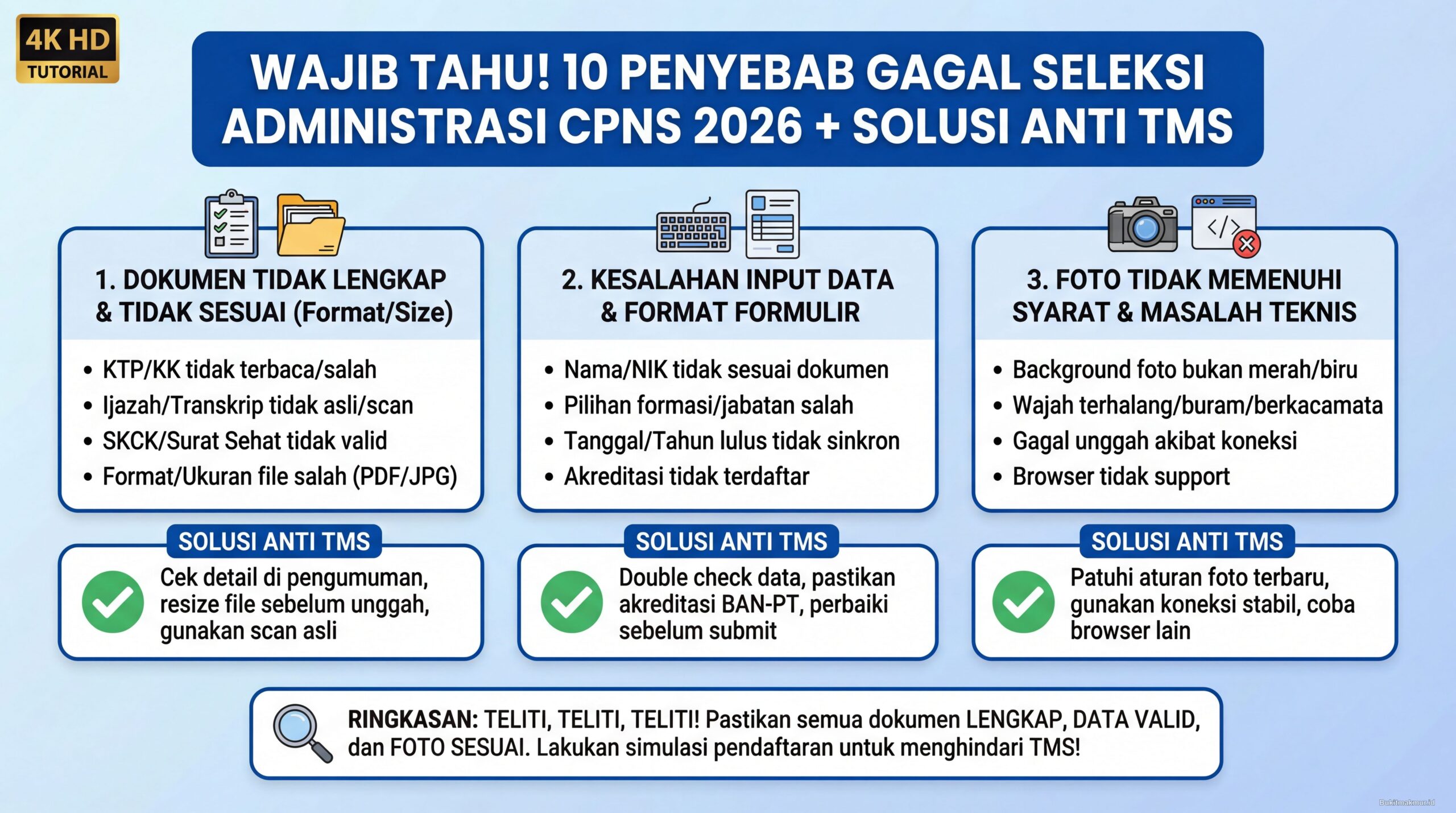 Artikel ini akan mengupas tuntas 10 penyebab utama kegagalan seleksi administrasi CPNS berdasarkan pola rekrutmen sebelumnya yang kemungkinan besar masih berlaku untuk CPNS 2026. Setiap penyebab dilengkapi dengan solusi praktis yang bisa langsung diterapkan, sehingga peluang lolos seleksi administrasi menjadi lebih besar.